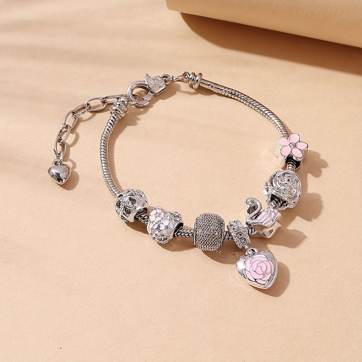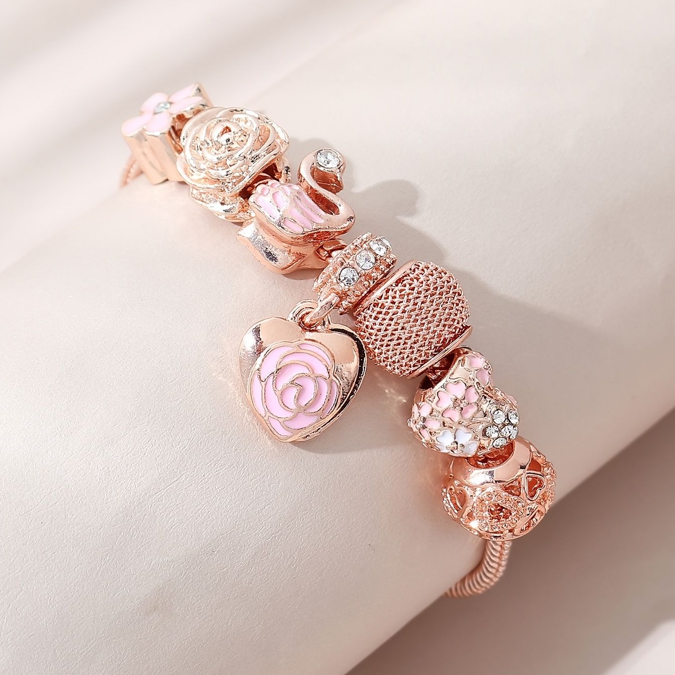 Flower Swan Charm Bracelet Rose Gold Color Rhinestone Bracelet DIY Beaded Copper Bracelet