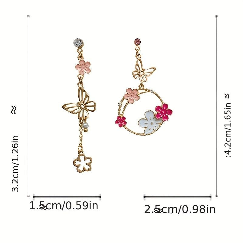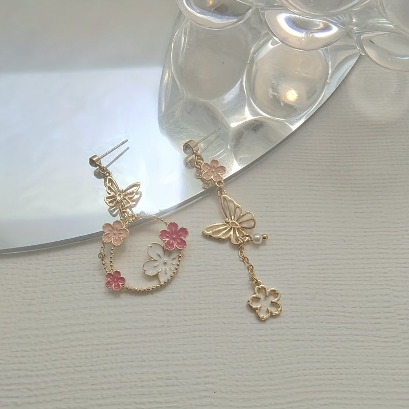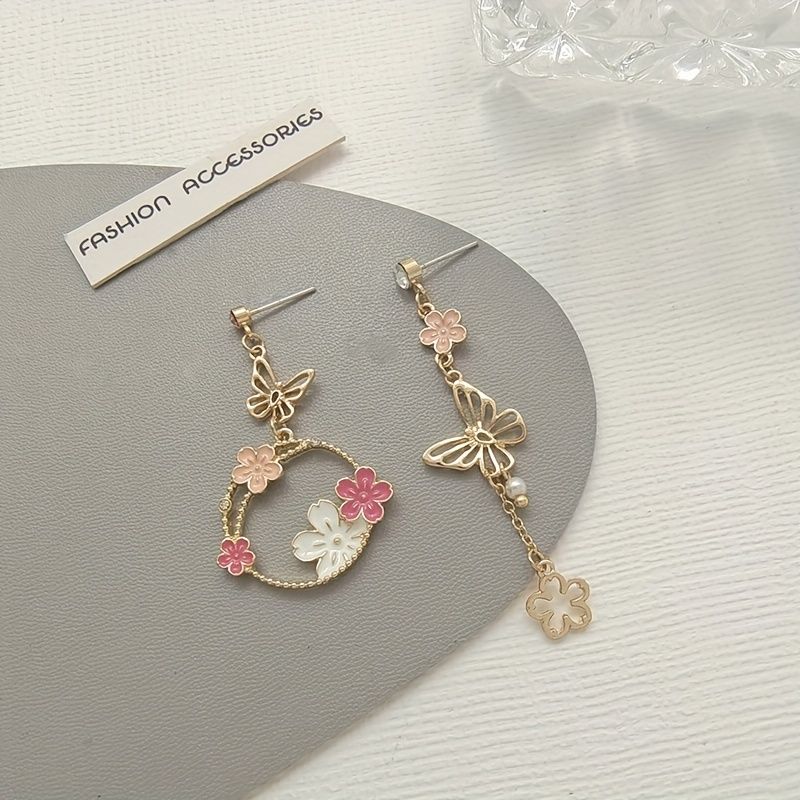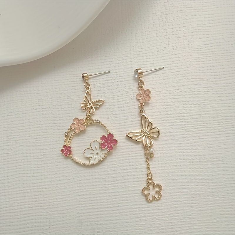Exquisite Butterfly Garland Flower Design Enamel Asymmetric Earrings Cute Cartoon Style Alloy 18K Gold Plated Jewelry Daily Casual