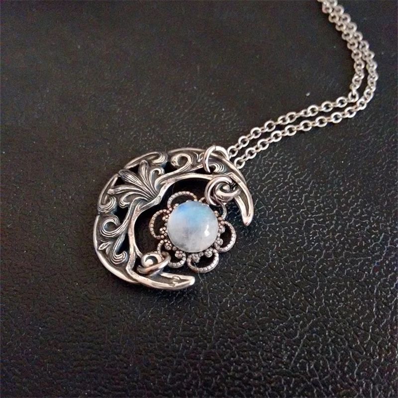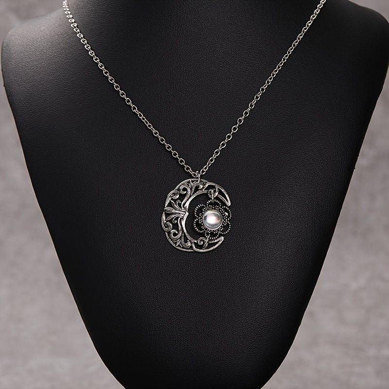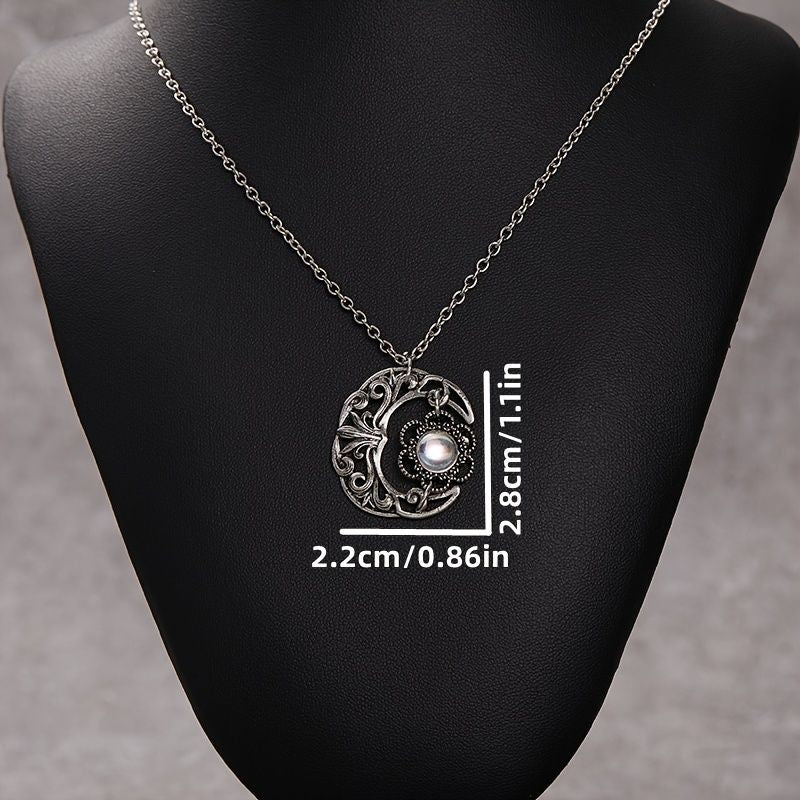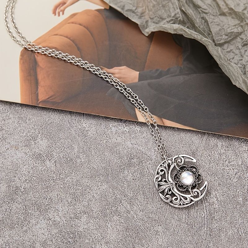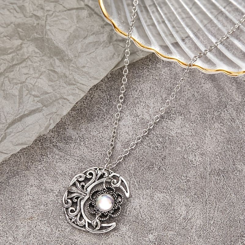 Boho Style Inlaid Moonstone Flower Texture Personality Hollow Moon Pendant Necklace Fashion Charm Ladies Metal Necklace Jewelry Gift
