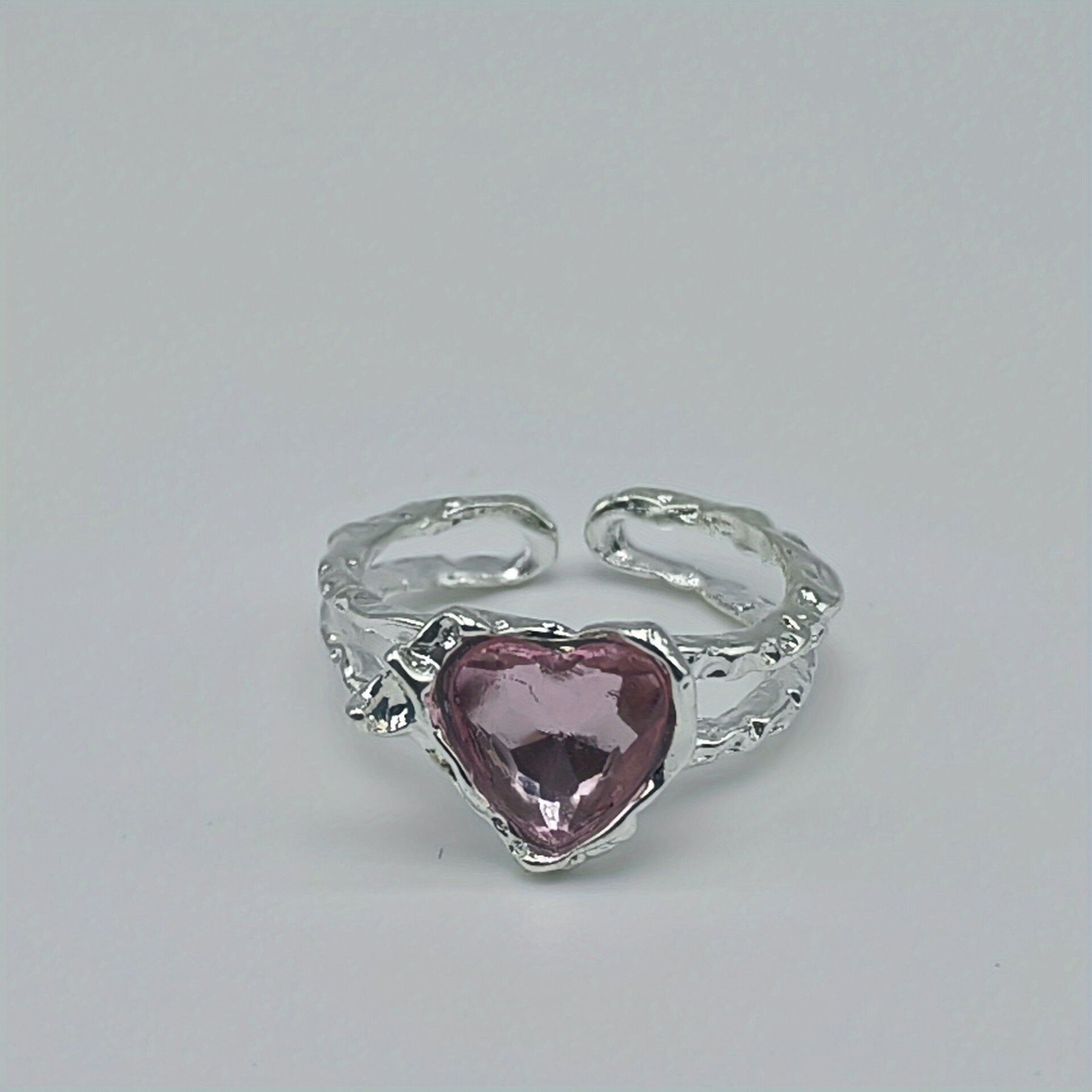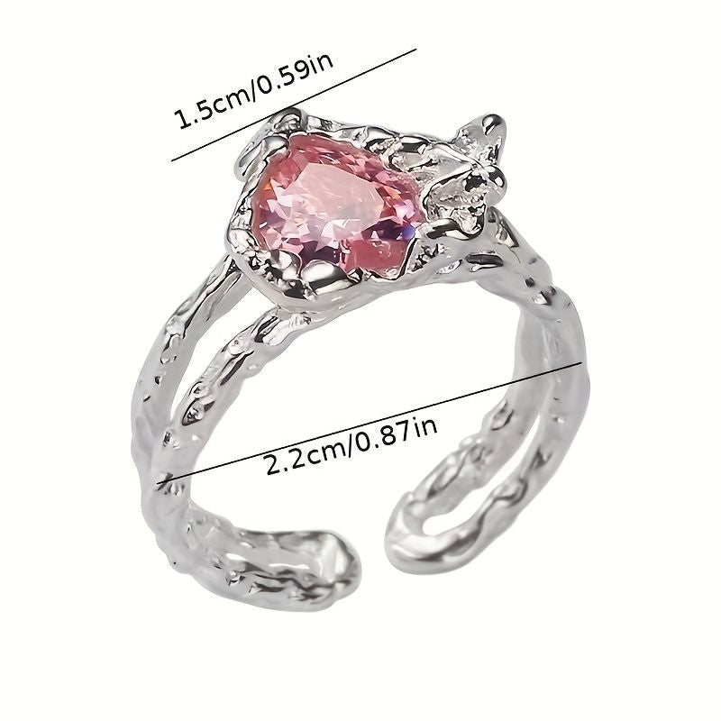 1pc, Sweet Cool Pink Love Heart Zircon Ring, Female Fashion Tin Foil Texture Open Ring, Double Hip Index Finger Ring