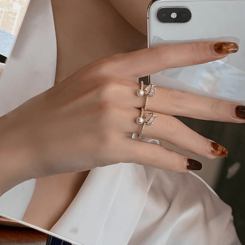 Personality Tulip Imitation Pearl Zircon Ring Classic Elegant Women's Open Adjustable Finger Ring Jewelry