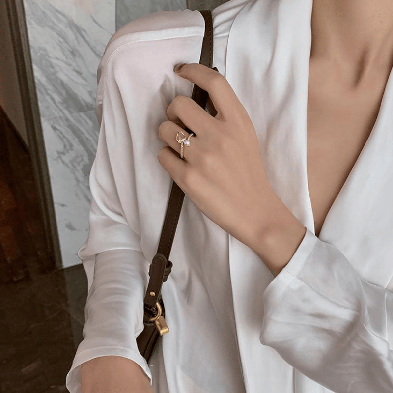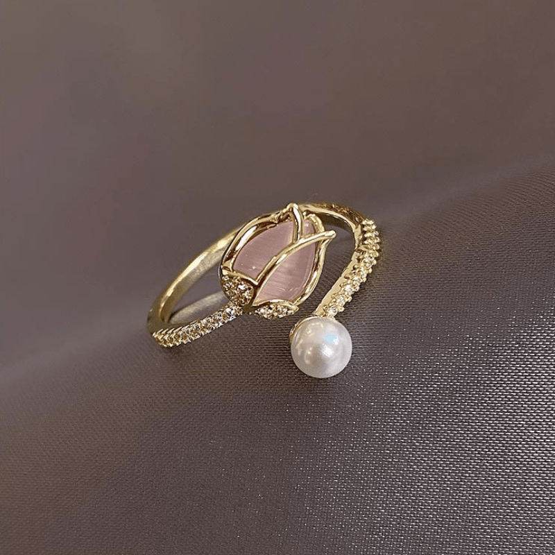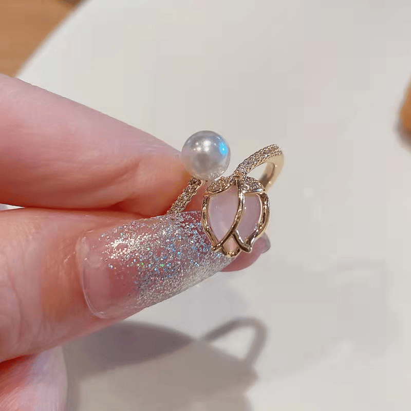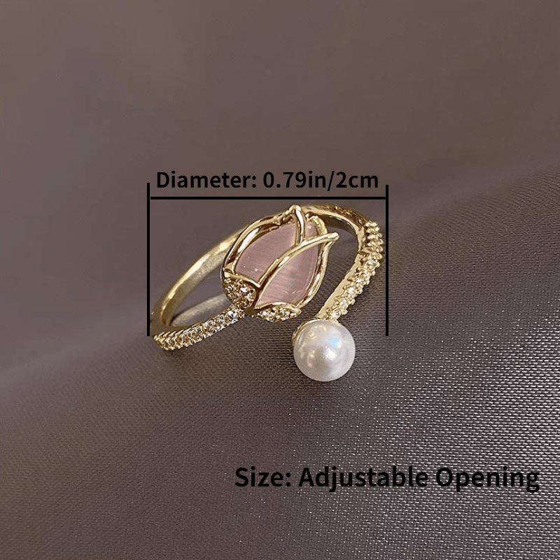 Personality Tulip Imitation Pearl Zircon Ring Classic Elegant Women's Open Adjustable Finger Ring Jewelry