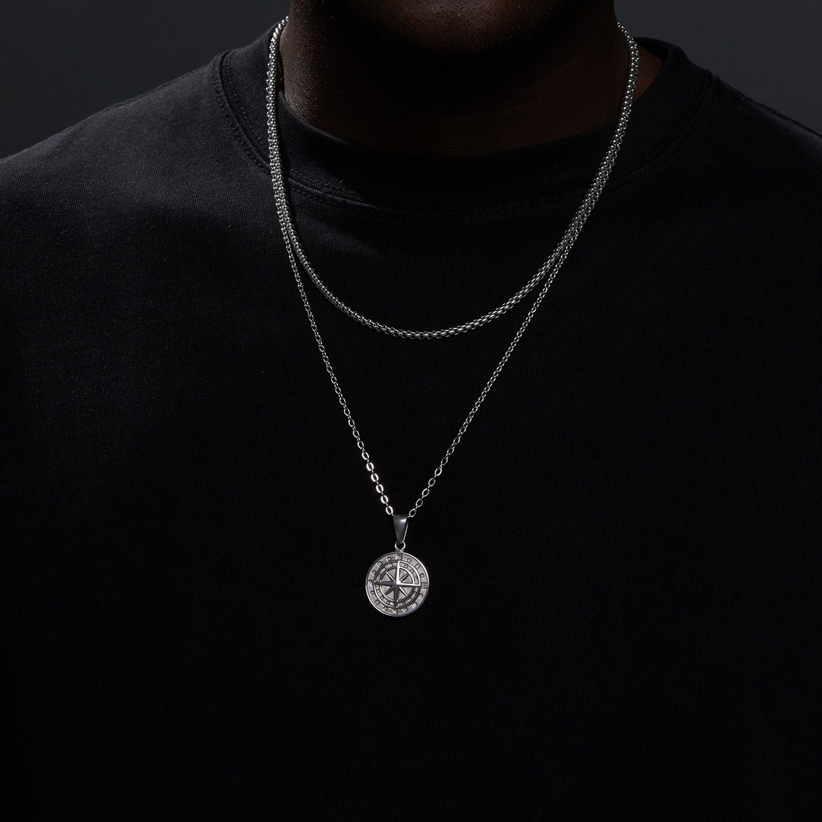 Layered Necklaces for Men; Sailing Travel Compass Pendant; Stainless Steel Cuban Figaro Wheat Chain; Casual Retro Collar